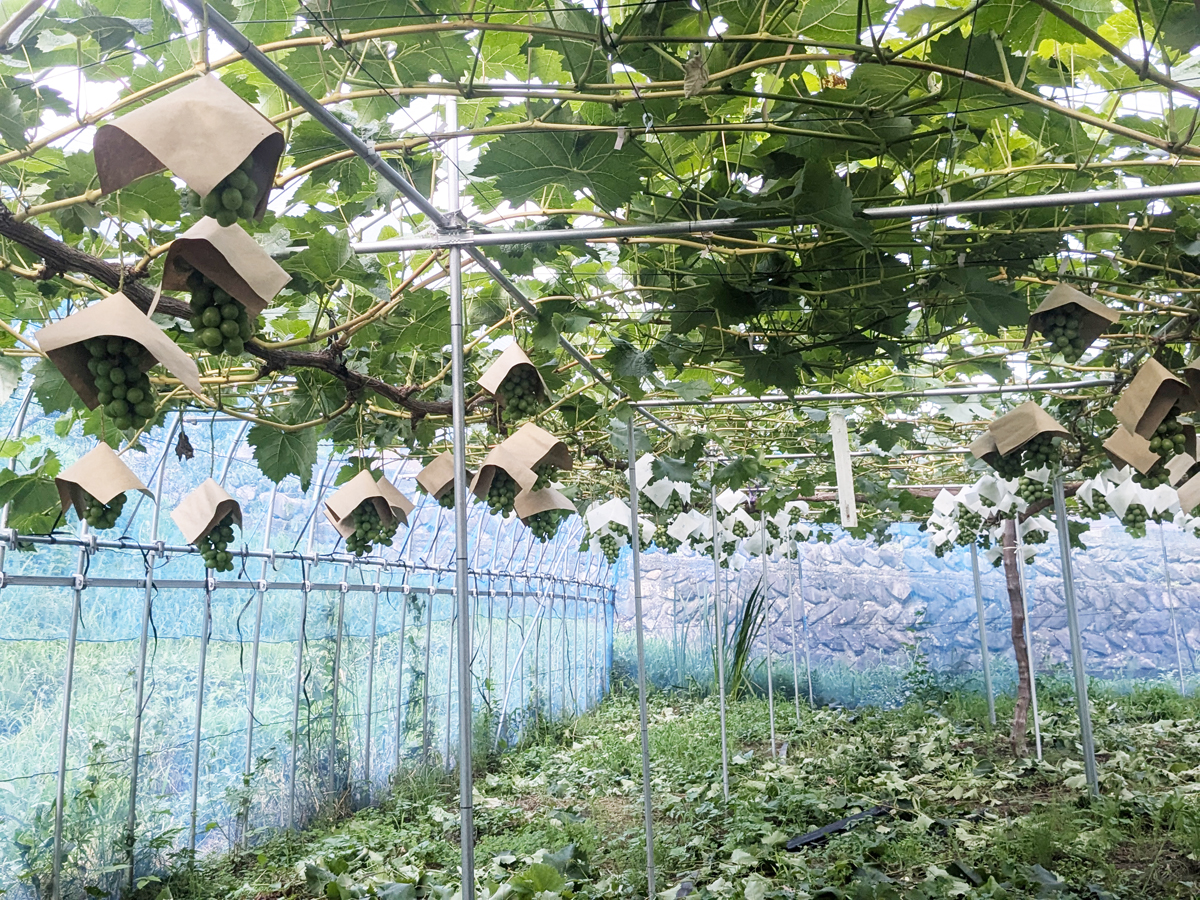 理也子さんが育てるぶどう畑。ここはまだ3年目で幹は細いが、枝ぶりもよく、まだ緑の実はよく膨んでいてこれから徐々に色づいていく。10月13日(日)開催予定の「青空市」が待たれる。塙町真名畑字佐賀草の佐ヶ草バス停前空き地で9時~15時。